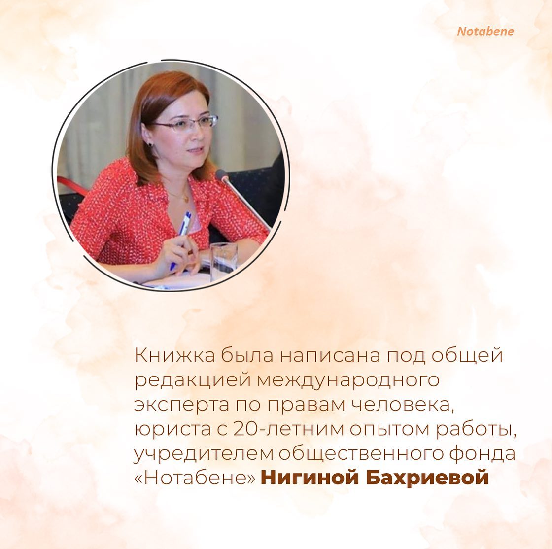 Одной из представительниц этой рабочей группы стала Нигина Бахриева, международный эксперт по правам человека и директор Общественного Фонда «Нотабене».
