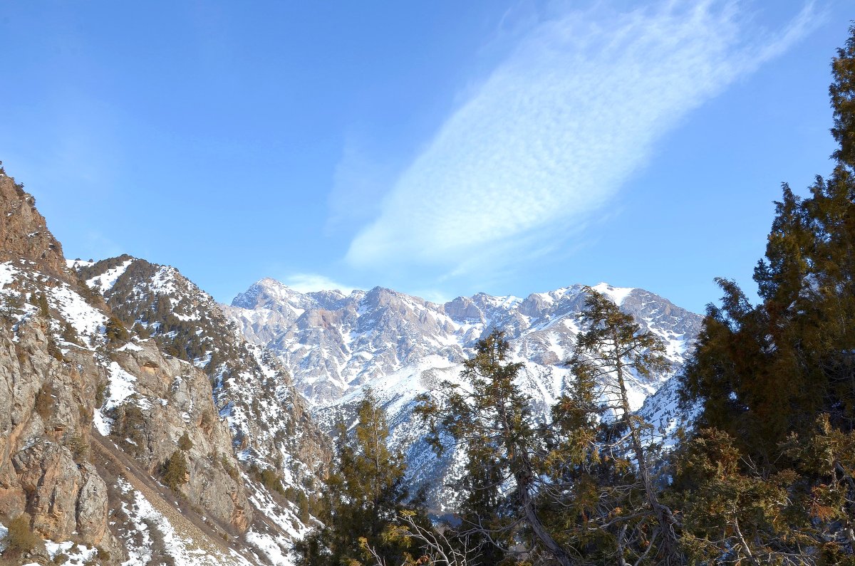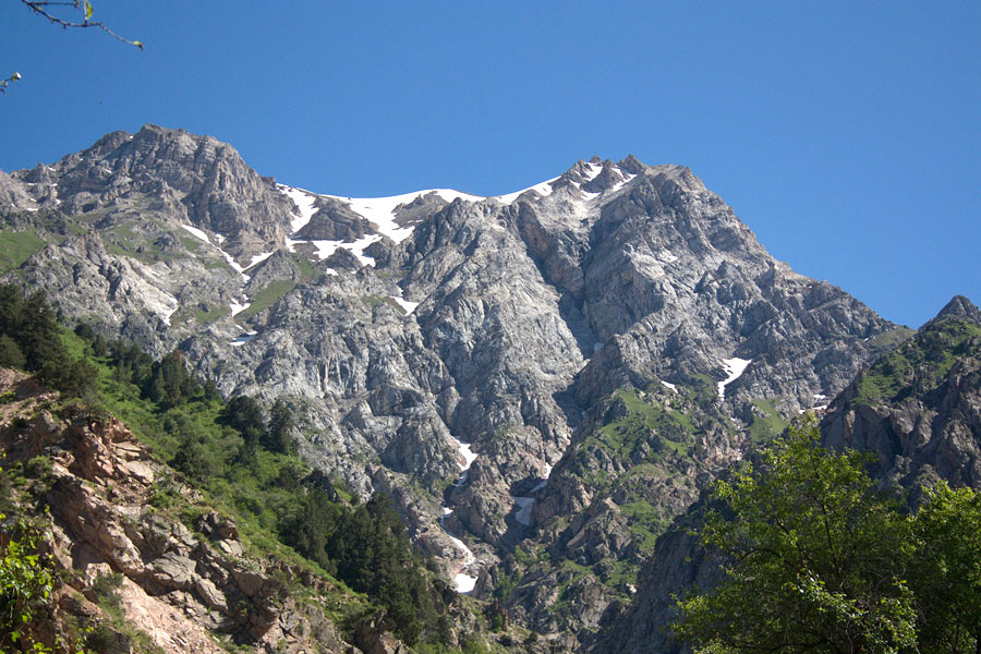 Протяженность хребта – сто километров, а самая высокая ее точка Сайрам – 4299 м. Узкие склоны гор на востоке покрыты снегом и толстым льдом.