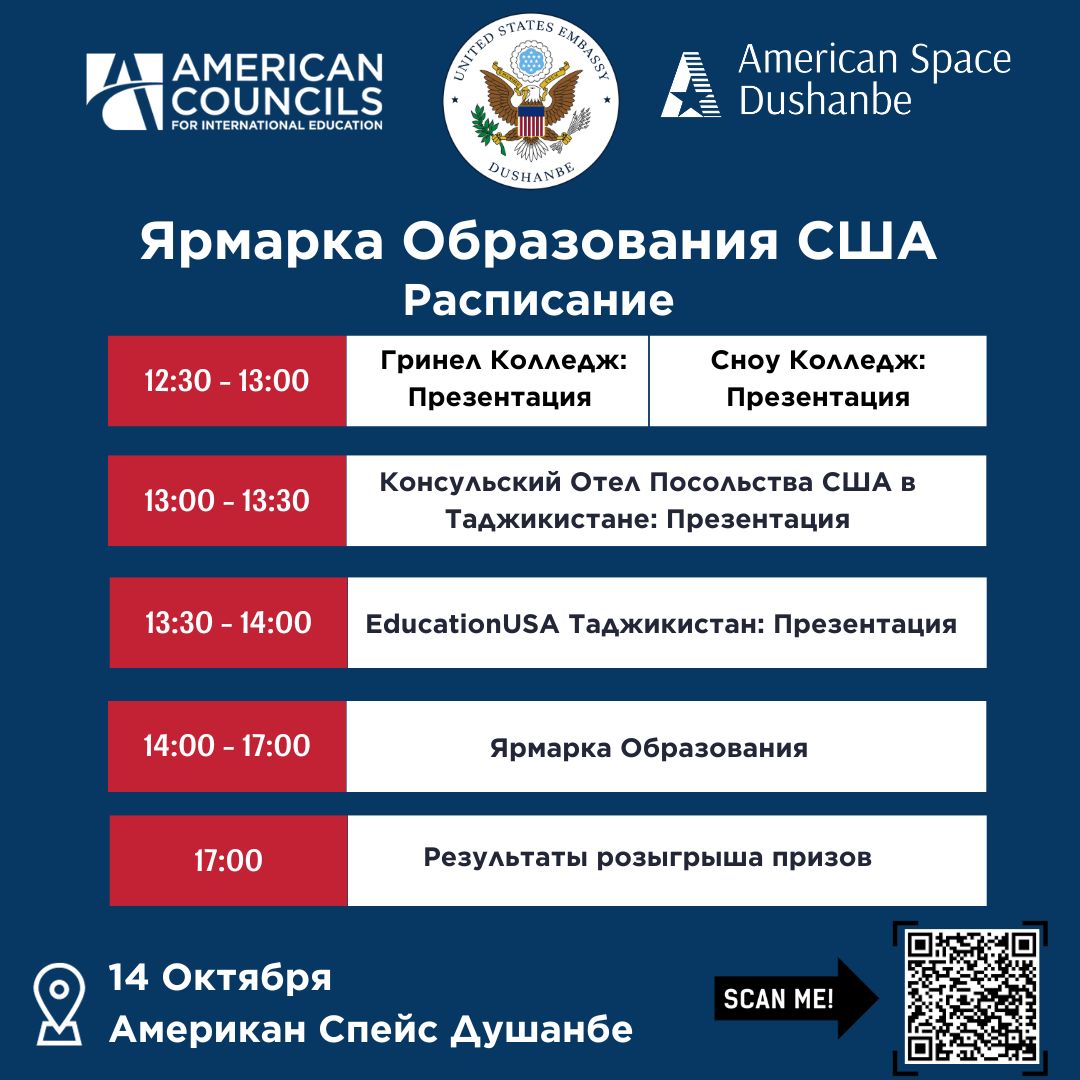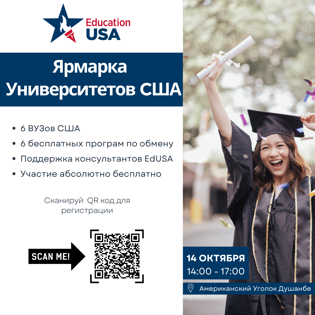 Ярмарка пройдет 14 октября с 12:00 до 17:00 в офисе American Space Dushanbe. На мероприятии будут присутствовать представители 6 американских ВУЗов и более 6 разных программ обмена, полностью спонсируемые Посольством США в Таджикистане.