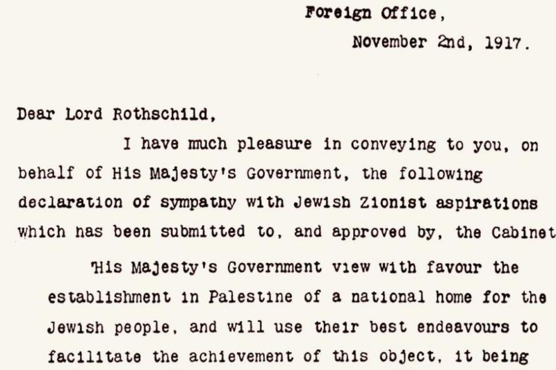 Министр иностранных дел Великобритании Артур Бальфур письмом уведомил лидера британских сионистов лорда Ротшильда, что «правительство Его Величества относится благосклонно к восстановлению национального очага для еврейского народа в Палестине и приложит все усилия, чтобы обеспечить достижение этой цели».