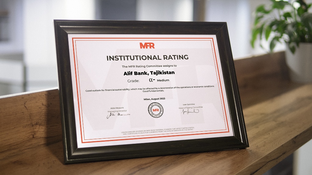 В июле — августе 2023 года в результате тщательного анализа международное рейтинговое агентство MicroFinanza Rating (Италия) присвоила Алифу институциональный рейтинг α- «Средний». Эта оценка свидетельствует о хорошем фундаменте, навыках управления рисками и финансовой устойчивости банка.