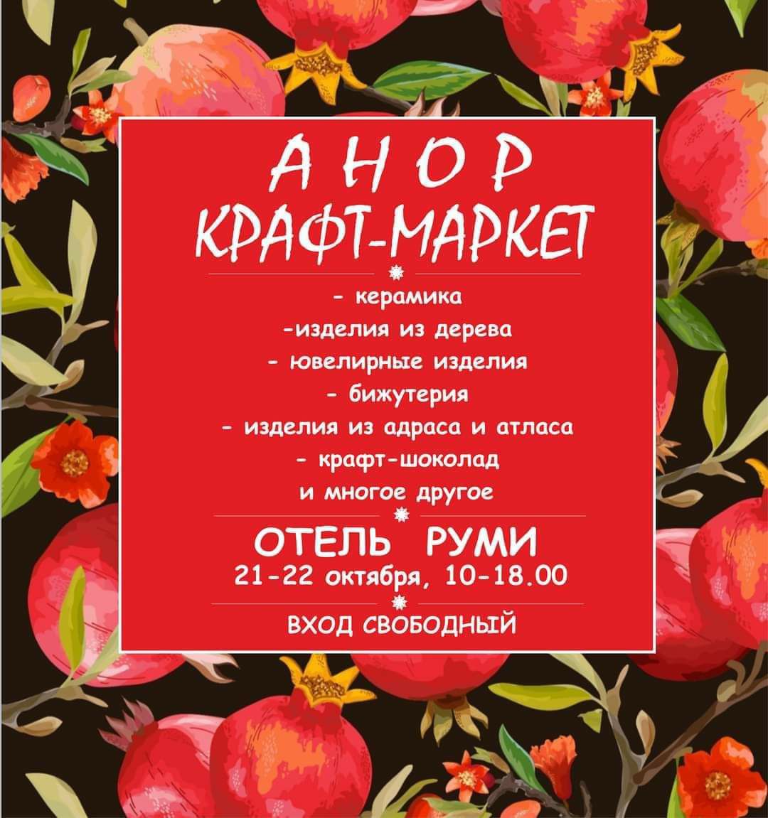 Ярмарка ремесленников пройдёт в новой локации — в отеле «Руми» 21 и 22 октября с 10:00 до 18:00. Только здесь вы найдете уникальные товары от лучших мастеров Таджикистана, Афганистана, Узбекистана и России. Если вы любите уникальные украшения, предметы интерьера, ткани, одежду, атрибутику, игрушки, сладости и косметические средства, сделанные вручную, то обязательно приходите!