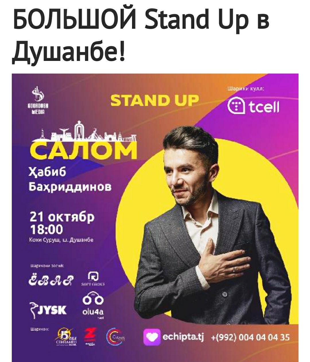 В «Кохи Суруш» 21 октября в 18:00 можно будет насладиться шутками от Хабиба Бахриддинова и посмеяться от души. Приходите и хорошее настроение на выходные вам обеспечено!