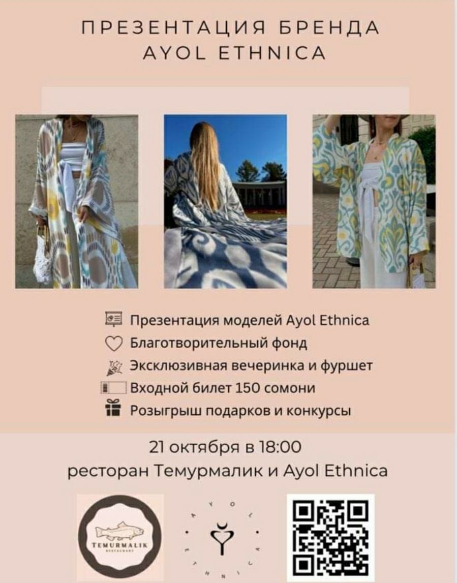 В Худжанде, в ресторане «Темурмалик» 21 октября в 18:00 состоится презентация моделей Ayol Ethnica. Вас ждёт эксклюзивная вечеринка, фуршет, конкурсы и розыгрыш подарков. Здесь будет шоу красоты, моды и драйва в стиле Икат.