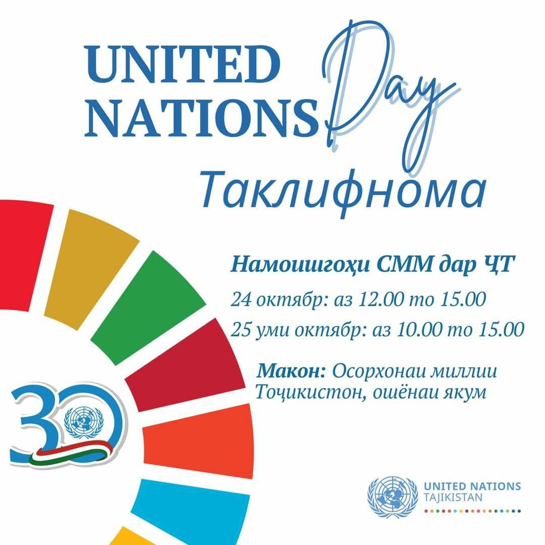 В Национальном музее Таджикистана на первом этаже 24 октября с 12:00 до 15:00 и 25 октября с 10:00 до 15:00 пройдёт выставка, посвященная Дню Организации Объединенных Наций, который во всем мире ежегодно отмечается 24 октября. В программе: фотовыставка о совместной деятельности ООН и Правительства Республики Таджикистан, практическая выставка агентств ООН об их деятельности в Республике Таджикистан, сессии, викторины.