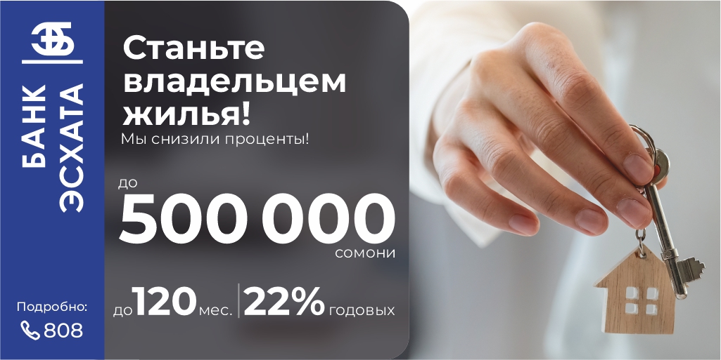Банк готов выдать 70% от стоимости жилья. Сумма кредита составляет от 10 000 до 500 000 сомони, кредит выдается в национальной валюте.
