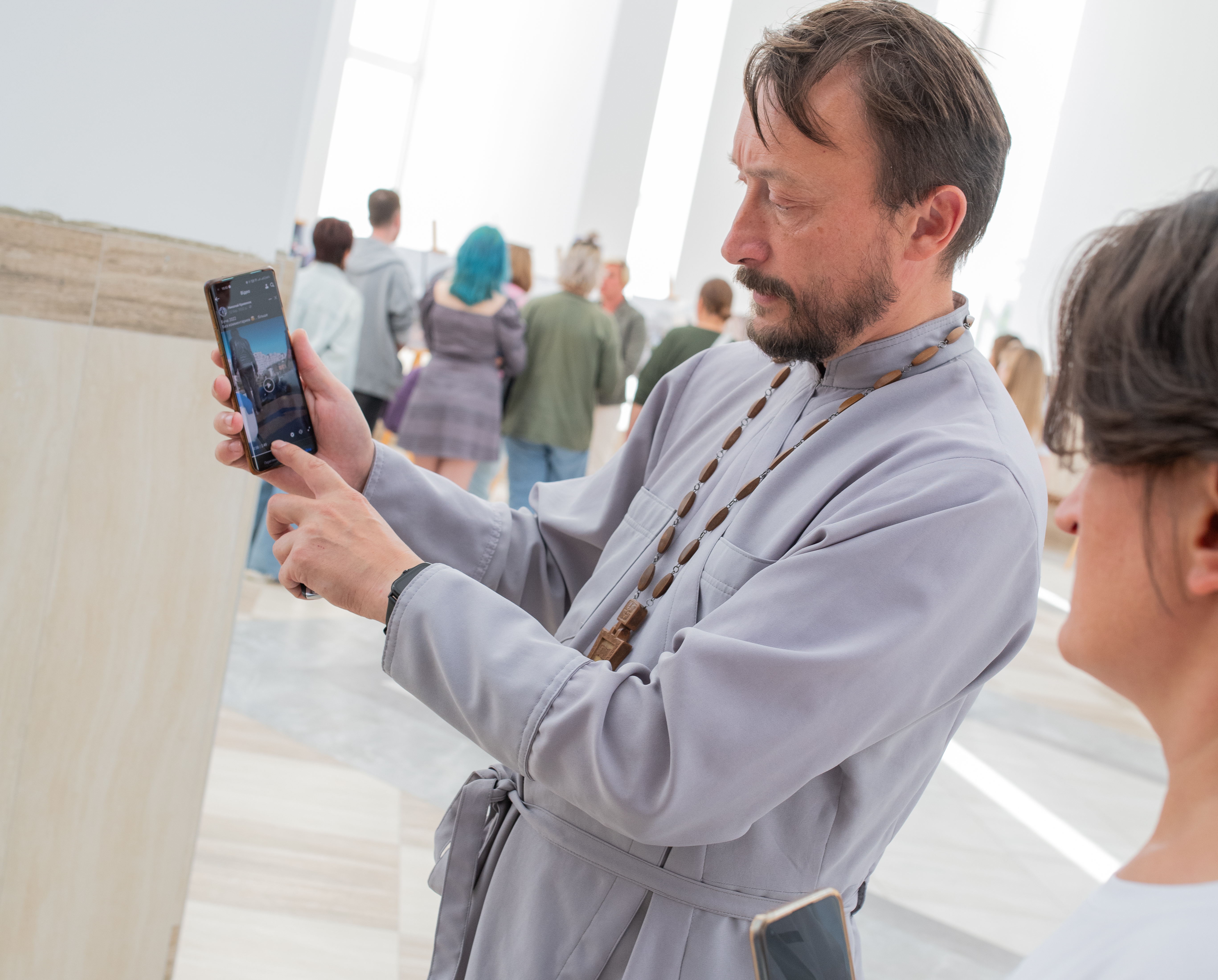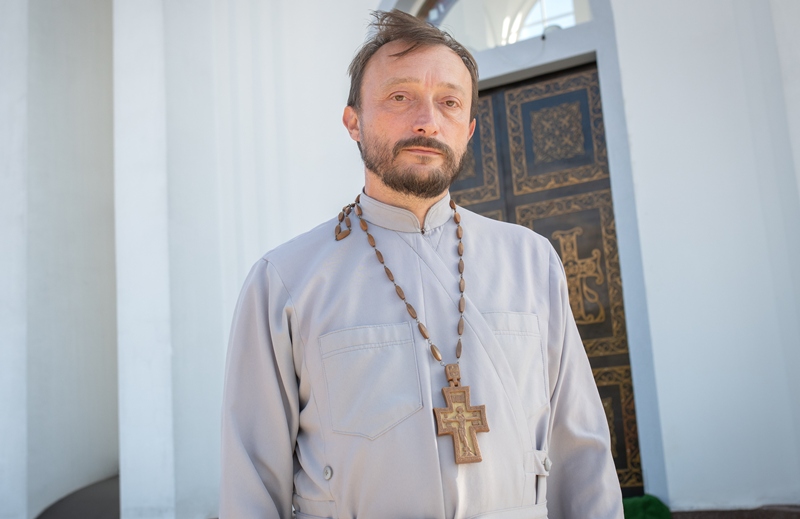 В самом храме установлены фотографии событий тех дней. Отец Андрей показывает видео со своего телефона, видео тех дней, когда они собирали и хоронили тела.