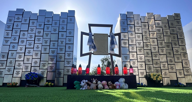 Отец Андрей ведет нас к мемориалу погибшим, расположенном позади храма. На некоторые из кубов нет имен жертв, это тела тех, кого так и не удалось опознать.