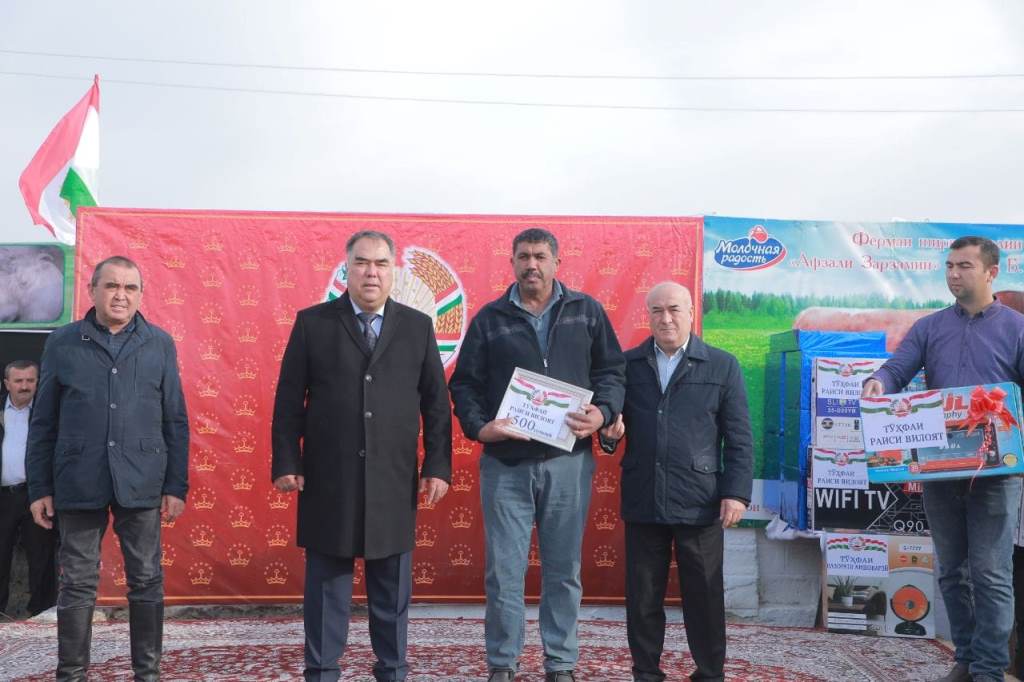 Глава области Раджаббой Ахмадзода вручил памятные подарки лучшим животноводам городов и районов области за достижения в разведении скота.