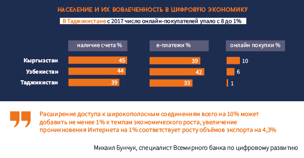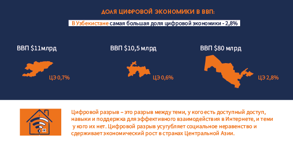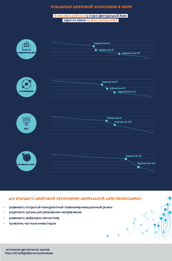 «В ИКТ входят мобильная связь, инфраструктура, финансовые технологии (POS, e-wallets, терминалы, безналичные расчеты, майнинг, биткоин). Село, в котором есть терминалы, автоматически становится частью цифровой экономики. Но ничего не будет, если не будет электричества. Если мы хотим сравнить страны Центральной Азии, самое важное в цифровой экономике – это интернет. Если слабый, то все остальные индикаторы будут слабыми», – объясняет эксперт.