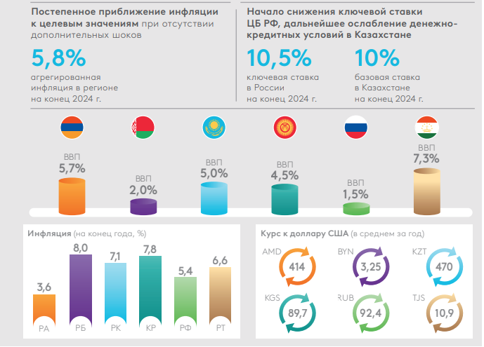 Экономический рост в Армении в наступающем году прогнозируется на уровне 5,7%, в Казахстане – 5,0%, Кыргызстана – 4,5%, в Беларуси – 2,0%, в России – 1,5%.