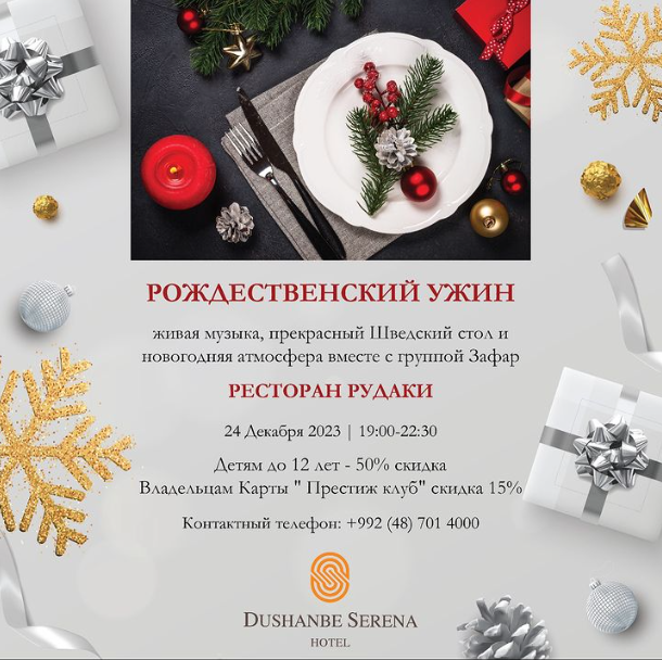 Отель Serena Dushanbe готовится к проведению рождественского ужина, предоставляя гостям возможность насладиться вечером в изысканной обстановке.