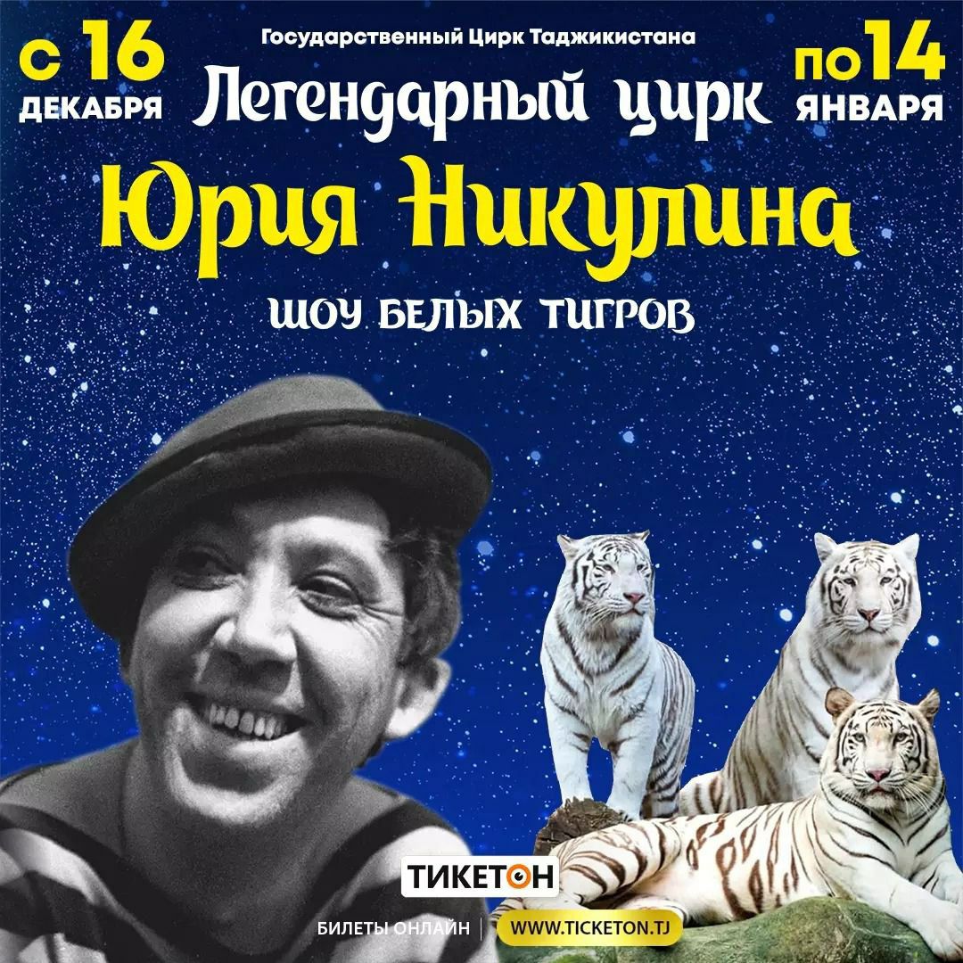 В Таджикском Государственном Цирке с 16 декабря по 14 января российский цирк Юрия Никулина покажет легендарное «Шоу белых тигров». Это единственный в мире аттракцион с дрессированными белыми тиграми, в исполнении Заслуженного артиста России Сергея Нестерова, собравшего аплодисменты сотен тысяч зрителей на цирковых манежах мира и ставшего звездой циркового фестиваля в Монте Карло.