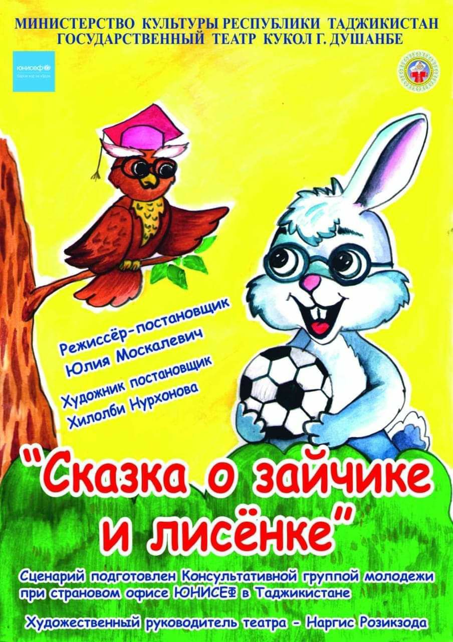 В Государственном театре кукол Душанбе 4 января в 12:00 и 7 января в 11:00 пройдёт показ программы «Поиграем вместе в новый год»: в фойе театра на первом этаже, а на втором, в зале театра, детей ждёт спектакль «Сказка о Зайчонке и Лисёнке».