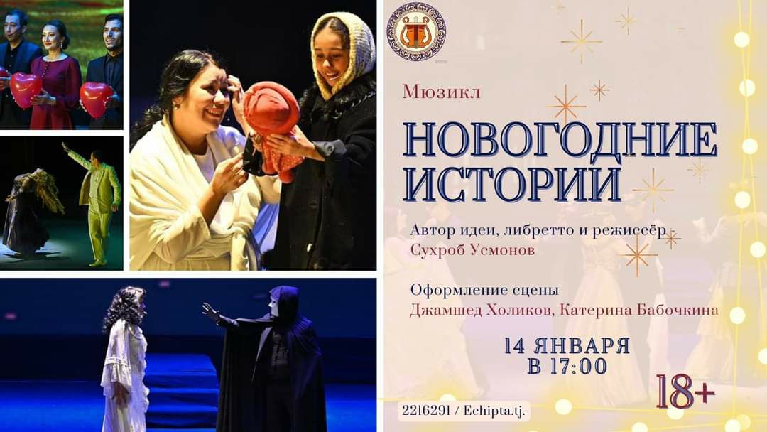 14 января в 17:00 состоится показ мюзикла «Новогодние истории» – премьеры этой зимы. Постановка главного режиссера театра Сухроба Усмонова получилась несколько кинематографичной благодаря художественному оформлению главного художника Джамшеда Холикова и Катерины Бабочкиной. В постановке рассказано несколько историй героев, длиной в новогоднюю ночь.