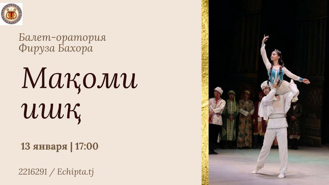 13 января в 17:00 состоится показ балета-оратории Фируза Бахора «Макоми ишк» (Мелодия любви). В спектакле примут участие все коллективы театра: балетная труппа, солисты оперы, хор и оркестр.