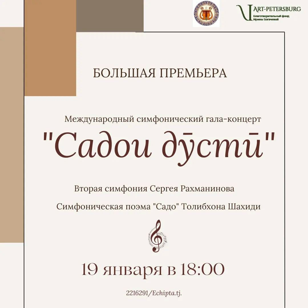В театре оперы и балета им. С. Айни 19 января в 18:00 состоится масштабный международный концерт «Садои Дусти», в рамках которого впервые на его сцене прозвучат Вторая симфония Сергея Рахманинова и симфоническая поэма «Садо» Народного артиста Таджикистана Толибхона Шахиди.
