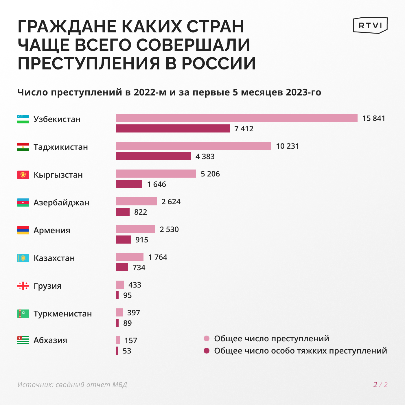 В сводном отчете МВД представлены данные с 2013 по май 2023 года о совершивших преступления иностранцах из девяти стран: Абхазии, Азербайджана, Армении, Грузии, Казахстана, Кыргызстана, Таджикистана, Туркменистана и Узбекистана.