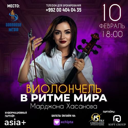 В «Кохи Суруш» 10 февраля в 18:00 состоится большой концерт популярной виолончелистки Марджоны Хасановой и "Ко". Вас ждёт интересная коллаборация классической и современной музыки – это симфонический оркестр, мощный звук и самое необычное звучание мировых хитов прошлого и современности.