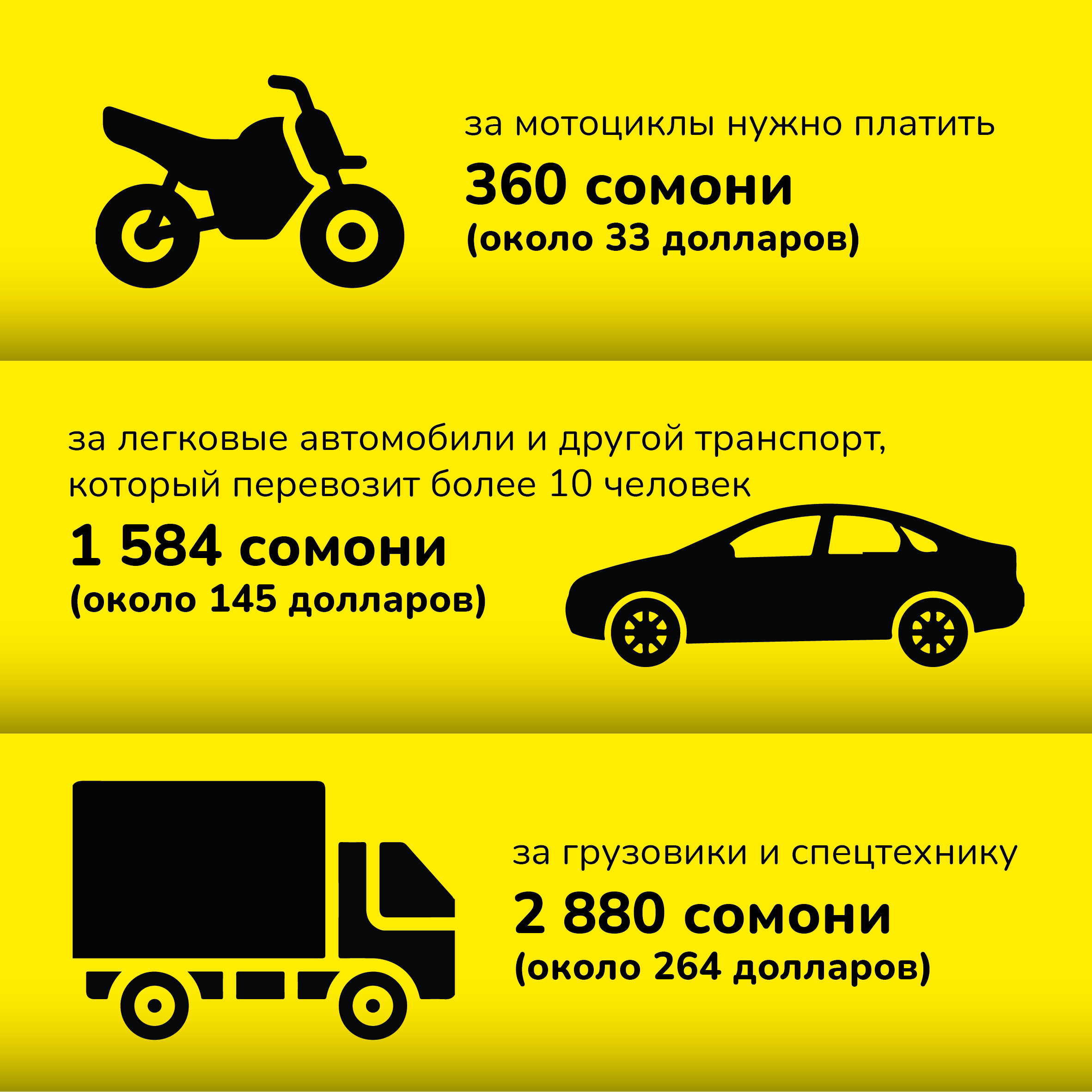 По подсчетам CABAR.asia, в случае сбора оплаты с этого количества транспортных средств в бюджет страны должно поступить около миллиарда сомони (91 миллион долларов).