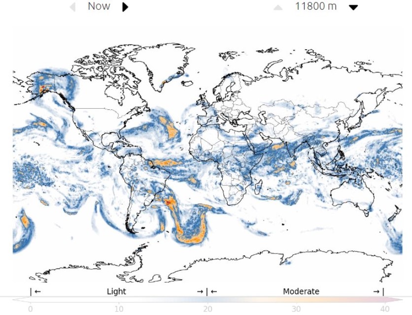 Турбулентность обозначается цветовыми градациями «тепловой карты», которые меняются от светло-голубого к синему и от оранжевого к красному.