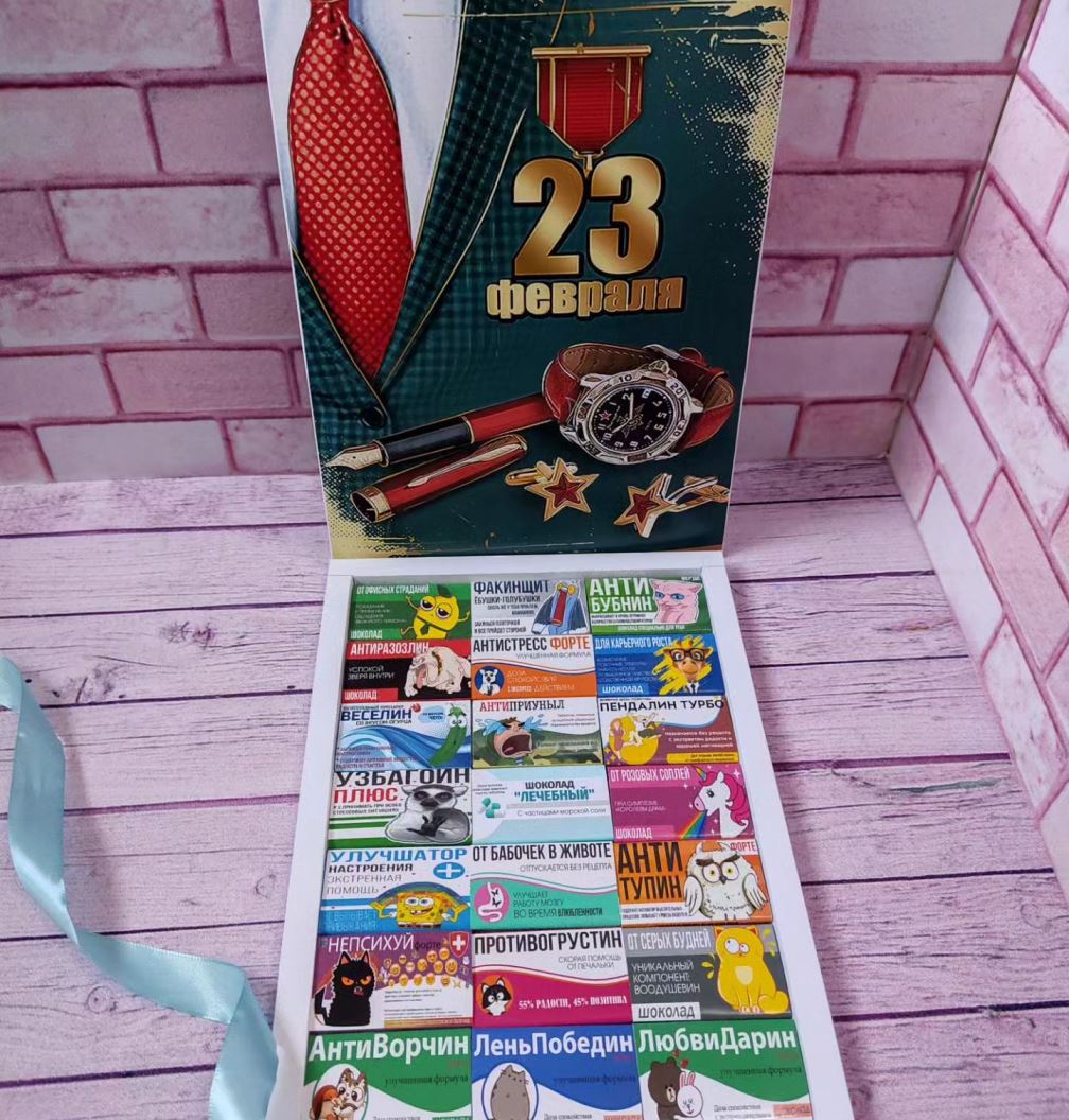 Упакован он в красивую коробочку ручной работы, выполненную с использованием лучших материалов. Внутри вы найдете вкуснейшие шоколадки с индивидуальной упаковкой и юмористическими высказываниями.