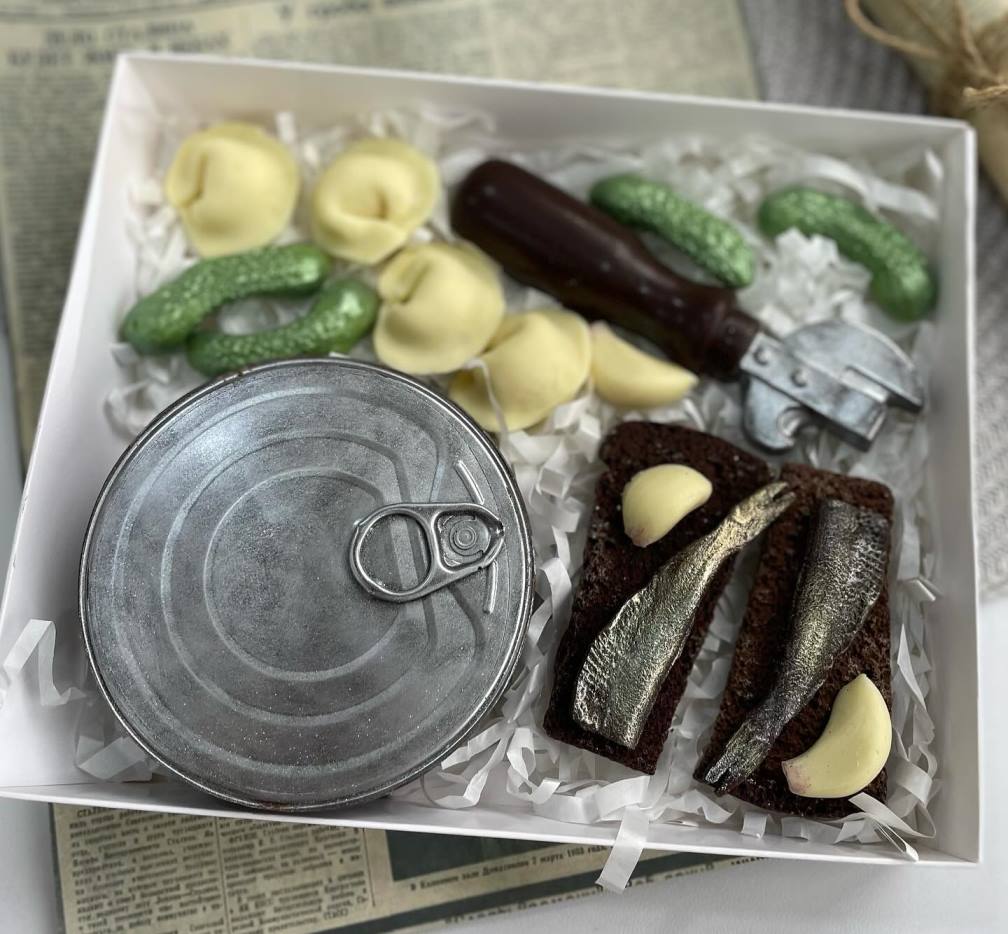 Консервная банка, бородинский хлеб, шпроты, открывашка из темного шоколад, пельмени, корнишоны, чеснок из белого шоколада. Для заказа пишите в директ.