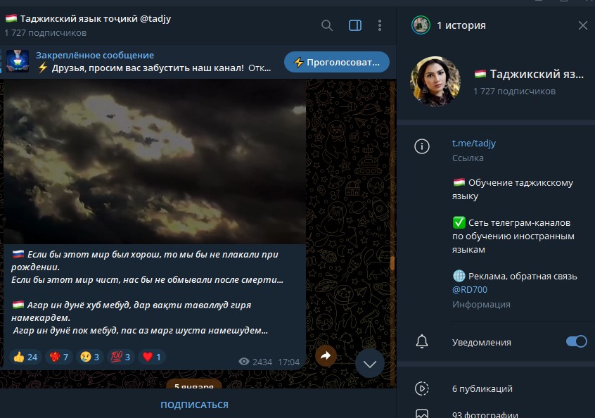А вот ссылка на телеграм-канал, где можно выучить таджикский язык бесплатно. Здесь он преподносится в виде повседневных фраз, слов и предложений в переводе с русского языка.