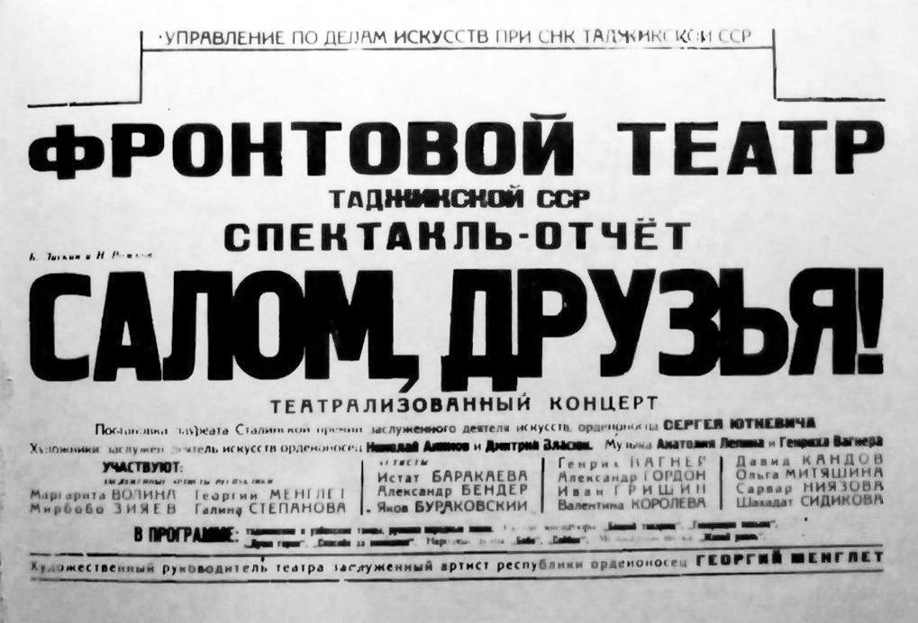 В 1943 году в ДКА был организован фронтовой театр Таджикской ССР. К 1 июня 1943 года подобрали состав театральной труппы. В нее вошли ведущие артисты таджикских и русских театров республики.