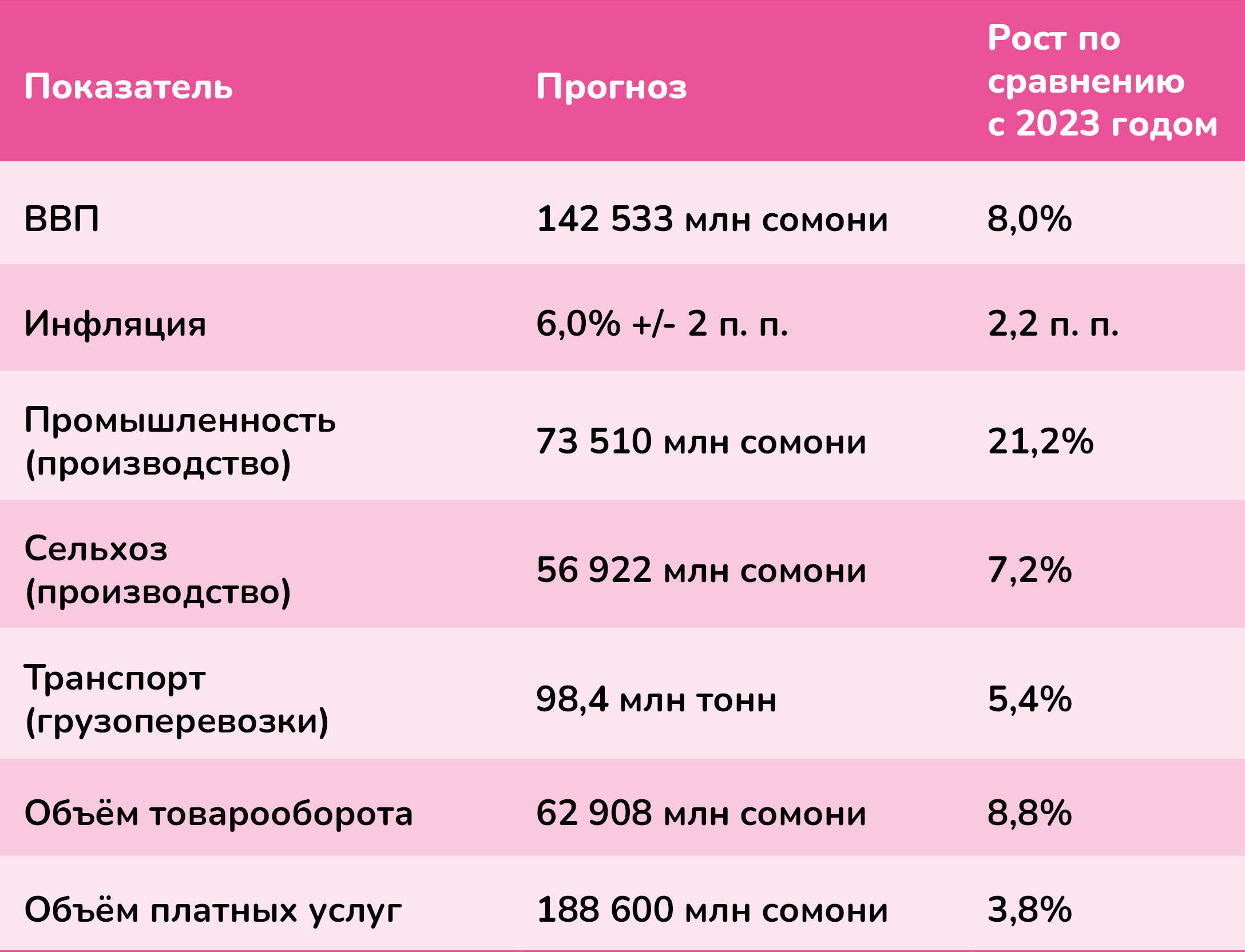 Президент страны Эмомали Рахмон в своем послании парламенту заявил о необходимости обеспечения темпов развития экономики в 2024 году на уровне не менее 8% посредством «эффективной реализации принятых программ и планов».