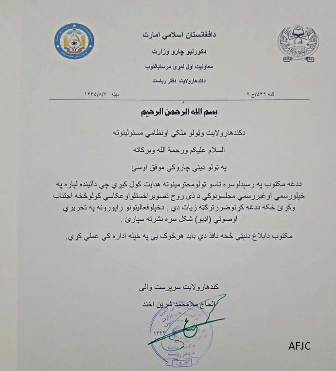 Центр отмечает, что получил доступ к копии приказа, подписанного Муллой Ширином Ахундом, исполняющим обязанности губернатора талибов в Кандагаре.