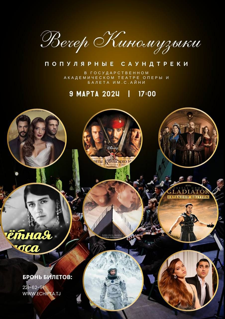 В Государственном академическом театре оперы и балета 8 и 9 марта в 17:00 пройдёт «Вечер киномузыки» с участием симфонического оркестра театра под управлением маэстро Далера Тиллоева. В программе вас ждут саундтреки из шедевров мирового, советского и отечественного кинематографа и турецких сериалов, с видео-сопровождением из их фрагментов.