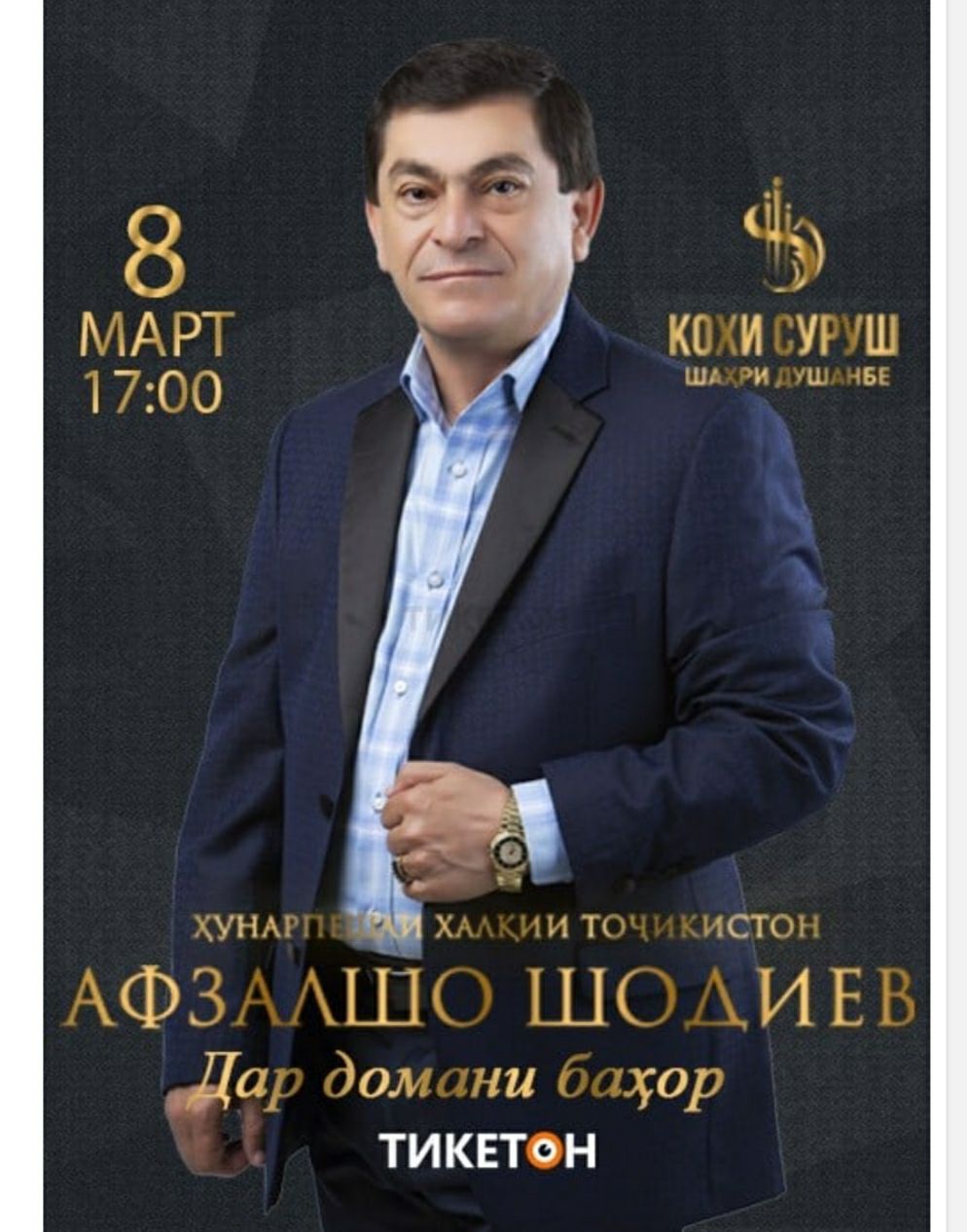 В концертном зале «Кохи Суруш» 8 марта в 17:00 состоится сольный концерт певца Афзалшо Шодиева «Дар домани баҳор».