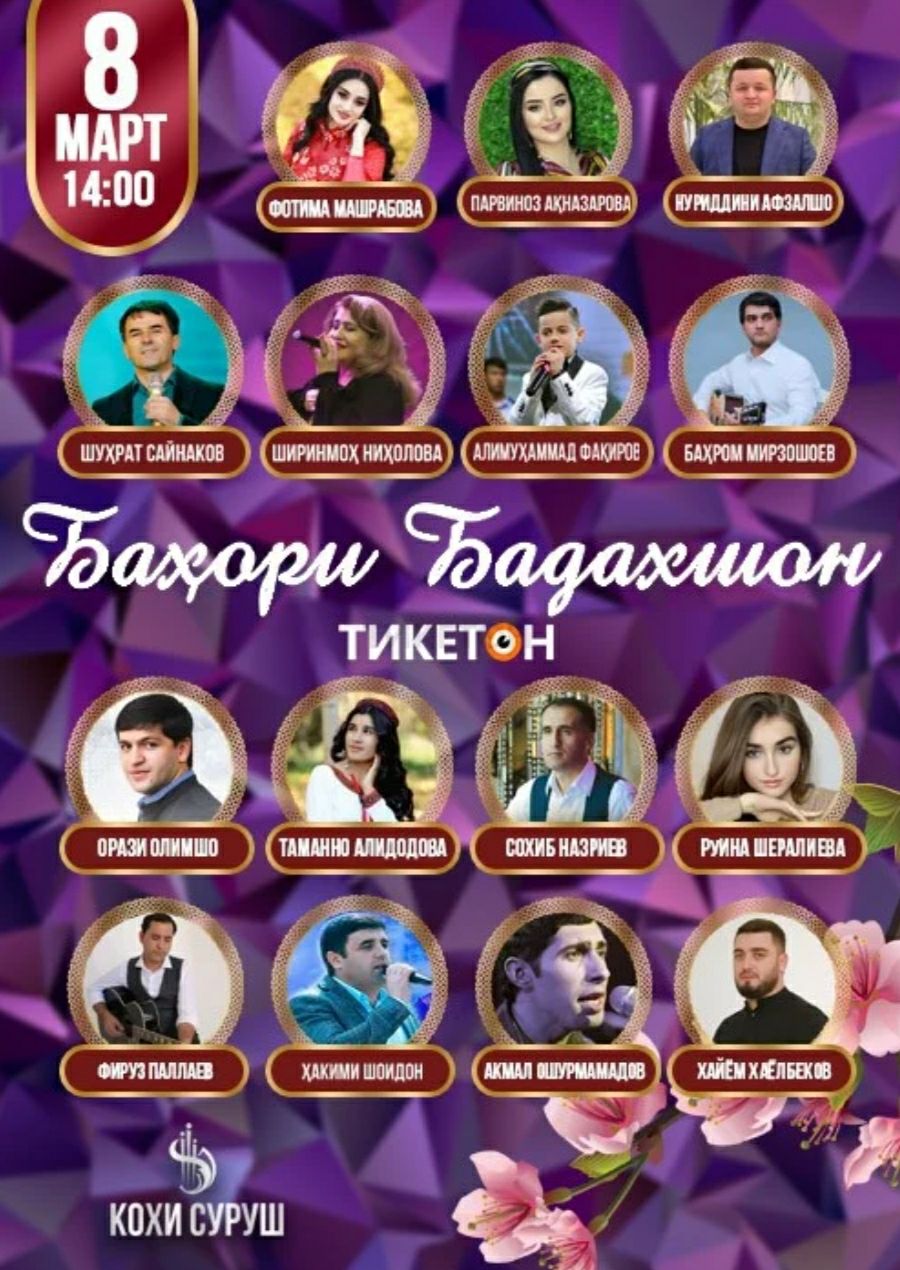 В концертном зале «Кохи Суруш» 8 марта в 14:00 состоится праздничный концерт «Бахори Бадахшон» с участием артистов: Шухрата Сайнакова, Парвиноз Акназаровой, Нуриддини Афзалшо, Таманно Алидодовой, Хаёма Хаёлбекова, Фируза Паллаева, Ширинмох Нихоловой, Акмал Ошурмамадов, Орази Олимшо, Алимухаммада Факирова, Бахрома Мирзошоева, Фотимы Машрабовой, Сохиба Назриева, Руины Шералиевой и Хакими Шоидон.