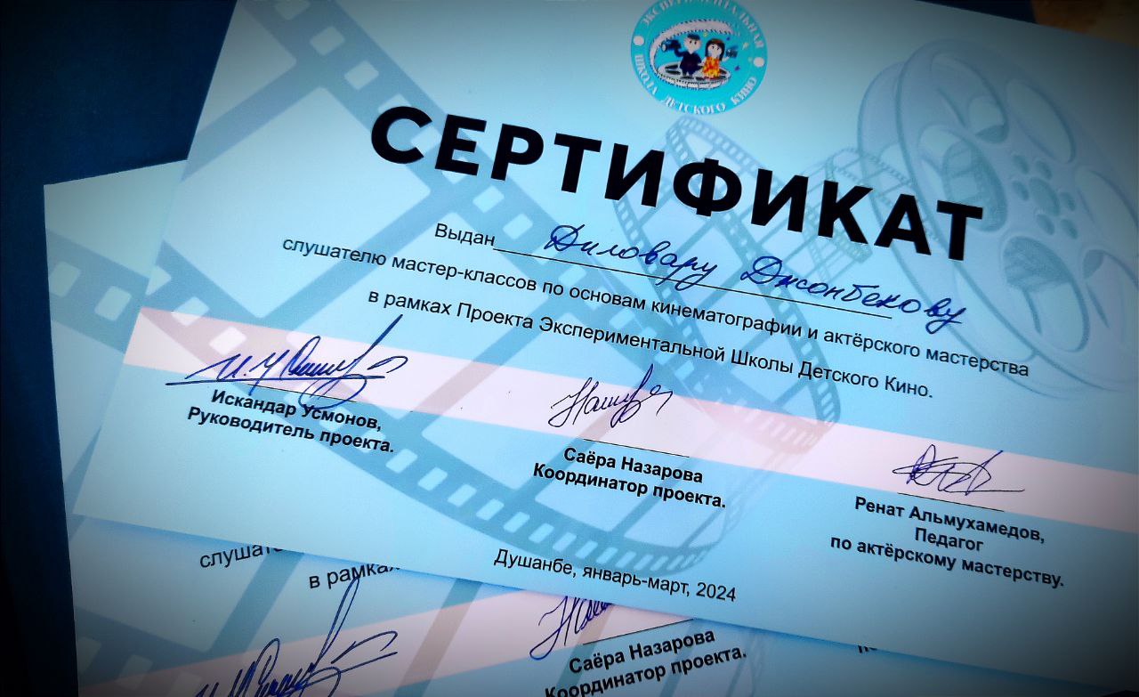 В Душанбе состоялось вручение Сертификатов об окончании актёрских курсов 12 ученикам Экспериментальной Детской Школы Кино. После двухмесячных мастер-классов от педагогов киношколы Рената Альмухамедова и Искандара Усмонова ученики приступят к практическим занятиям. Это будет съёмка короткометражных фильмов — сказок народов мира на таджикском языке.