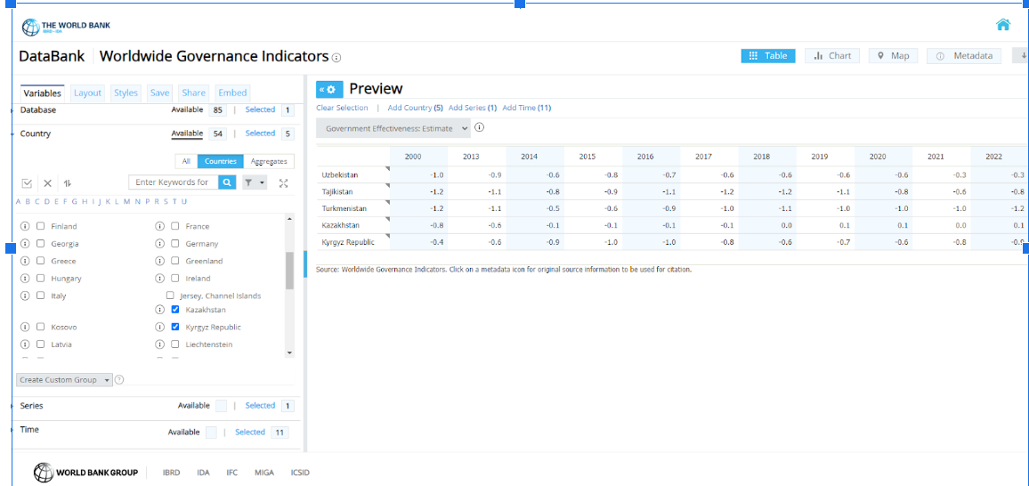 В рейтинге Всемирного банка (ВБ) по оценке эффективности правительства Таджикистан все последние 20 с лишним лет находится стабильно в нижней части таблицы. Примерно такая же ситуация в соседних странах, кроме Казахстана, где показатели эффективности госаппарата значительно выше.