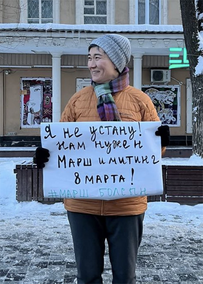 После отказа властей в 2024 году Жанар Секербаева вместе с другими активистками из «Феминиты» и оргкомитета шествия запустили кампанию #маршболсын. Девушки месяц выходили с пикетами в Алматы, чтобы добиться права заявить о гендерных проблемах.