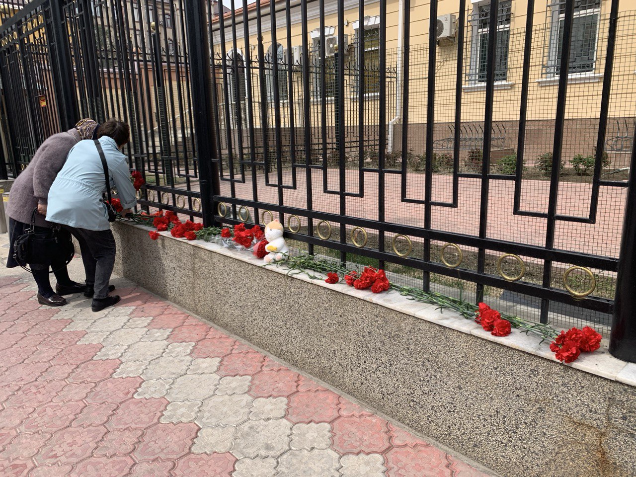 В Ташкенте горожане тоже оставляют цветы перед зданием посольства России в знак скорби по погибшим в теракте под Москвой. Перед зданием посольства установлен стол, на котором можно оставить цветы, зажжены свечи.