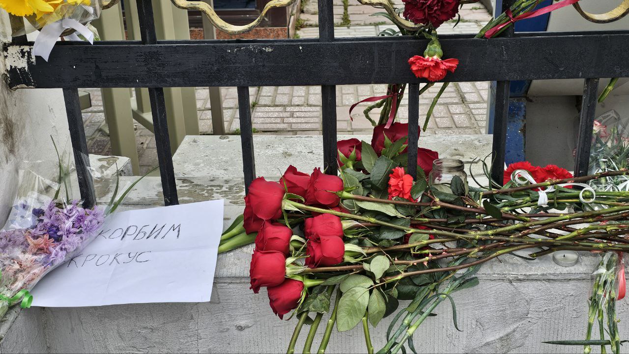 Жители Таджикистана в знак скорби и солидарности с Россией в связи с трагическими событиями в «Крокус Сити Холле» в Москве несли цветы к зданию посольства РФ в Душанбе