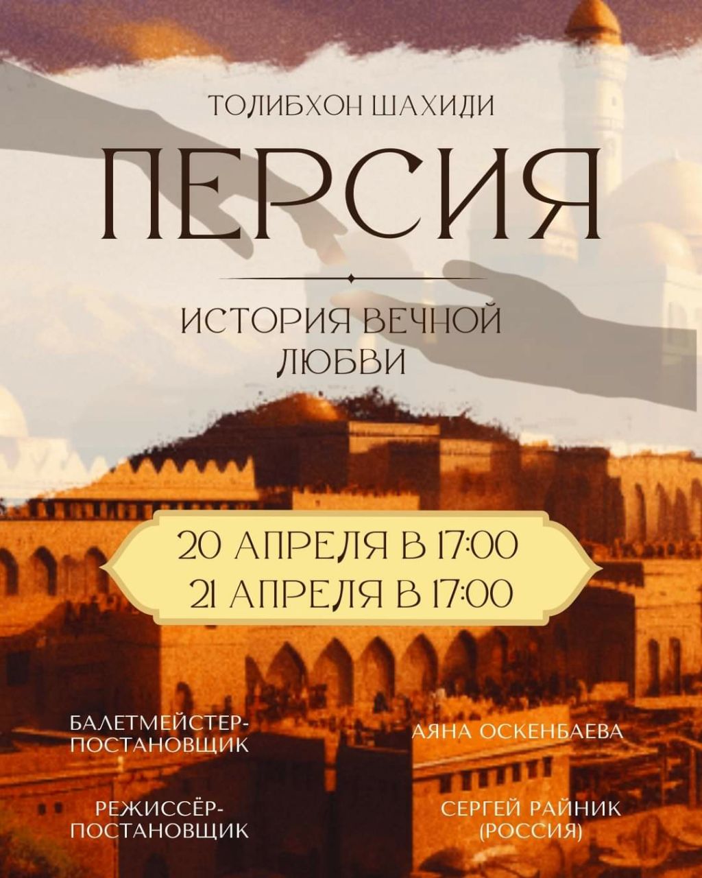 В Государственном академическом театре оперы и балета им. С. Айни 20 и 21 апреля в 17:00 состоится премьера бэлетной постановки «Персия: История вечной любви» на музыку Народного артиста Таджикистана Толибхона Шахиди.