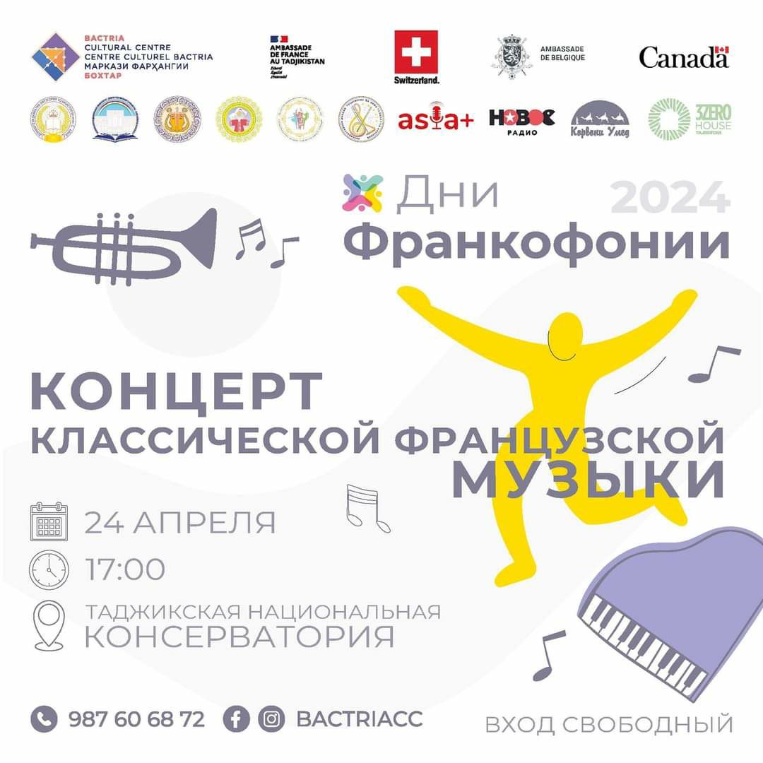 На сцене Таджикской национальной консерватории им. Т. Сатторова 24 апреля в 17:00 в рамках Дней Франкофонии состоится концерт французской классической музыки.