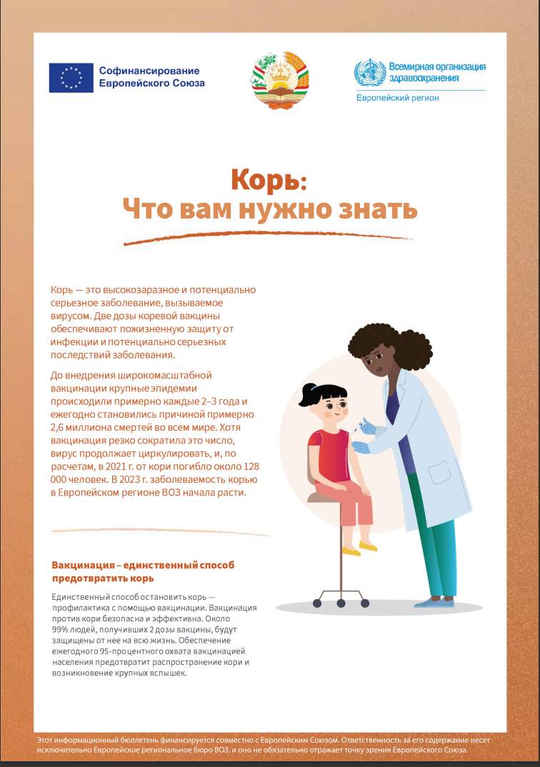 В 2024 году ряд стран Европейского региона ВОЗ, включая страны Центральной Азии, борются с продолжительными вспышками кори. Подобные вспышки подчеркивают важность вакцинации и мер общественного здравоохранения для предотвращения её распространения на территории Таджикистана.