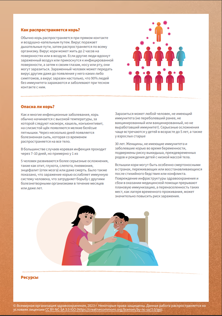 Всемирная организация здравоохранения подготовила информационные материалы о том, чем опасна корь, как распространяется и какими способами можно её предотвратить.
