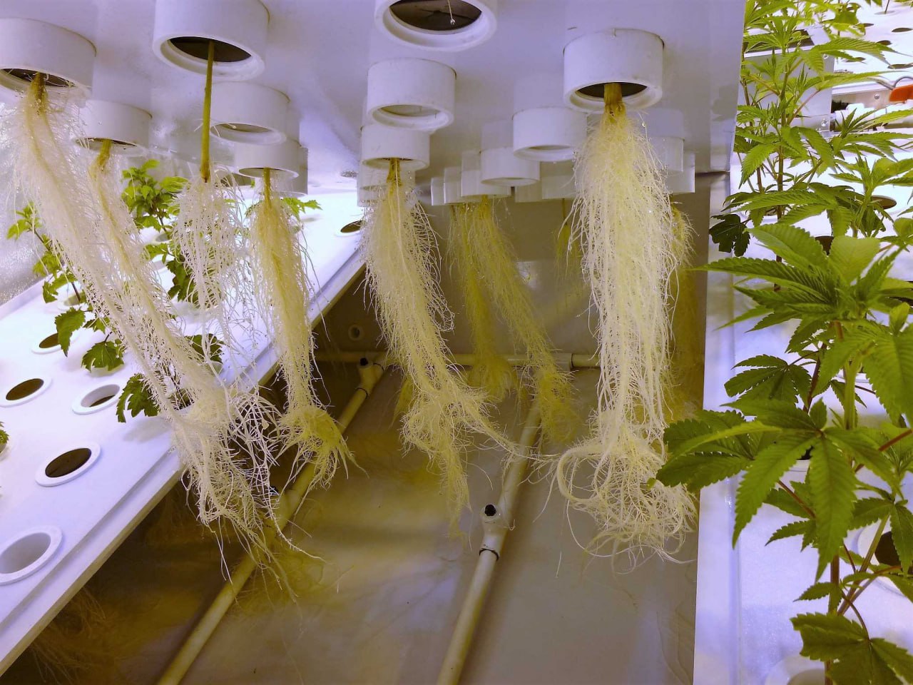 При этом само растение закрепляется опорной системой, а корни просто висят в воздухе, орошаемые питательным раствором. Листья и ствол растения изолированы от зоны распыления.