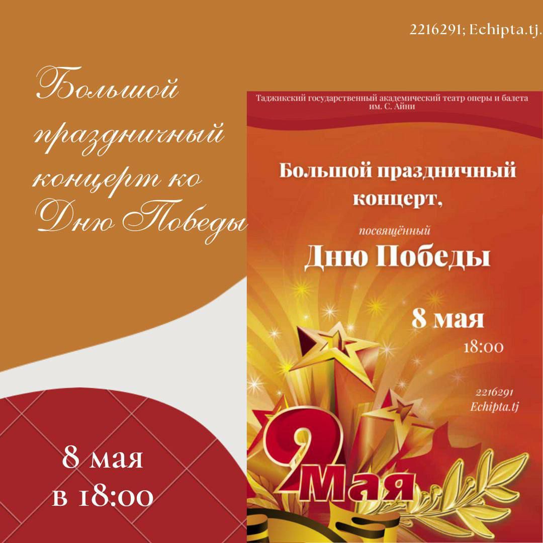 В театре оперы и балета им. С. Айни в 18:00 состоится большой праздничный концерт, посвящённый Дню Победы. Вы сможете окунуться в прошлое и послушать знакомые песни военных лет.