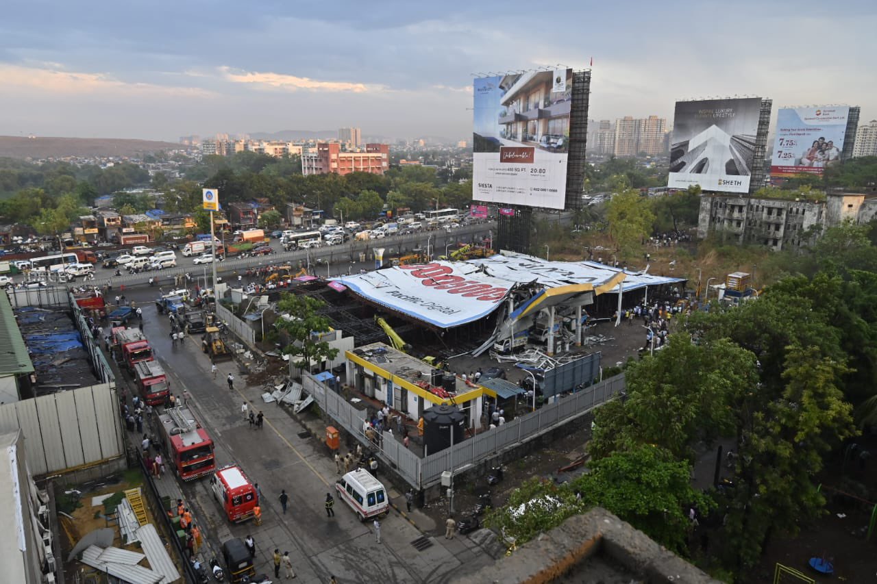 Билборд размером 70 на 50 метров упал на дома и заправочную станцию в районе Гхаткопаре днем в понедельник, когда на город обрушились ливень и пыльная буря, сообщает телеканал India TV.