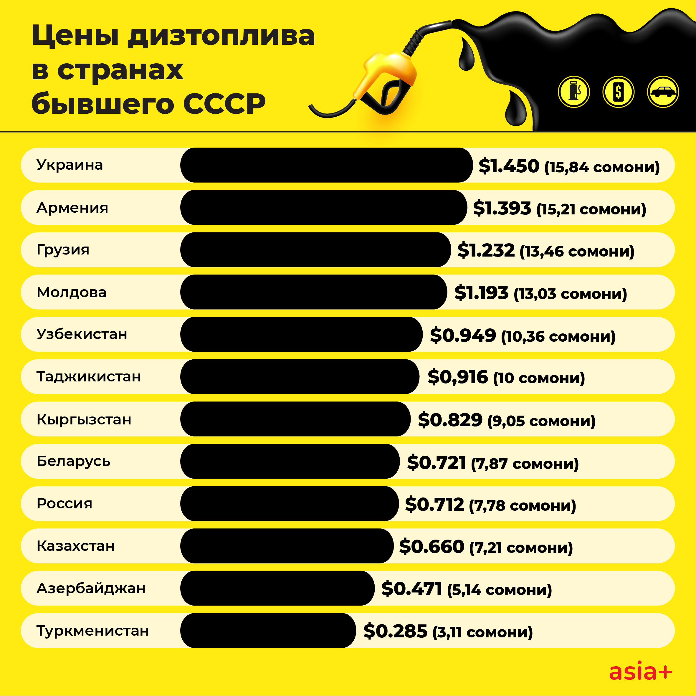 Таджикистан мог бы разделить место с Узбекистаном по своим показателям, но его в данном рейтинге нет (цены взяты у продавцов дизтоплива в РТ также по состоянию на 10 мая, — ред.).