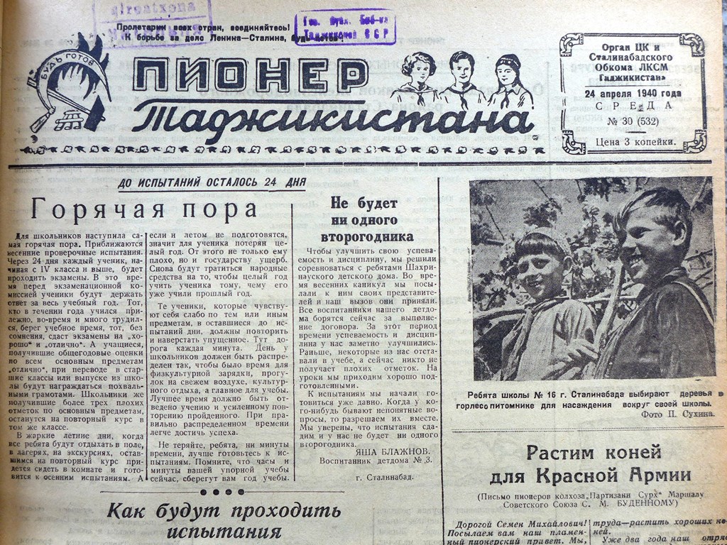1933 год – количество пионеров в Таджикской ССР достигло 35 тыс.. Среди пионеров всегда были передовики, герои и ударники труда. Имена большинства из них сейчас нам ни о чем не говорят, а в то время они были примерами служения стране, о них постоянно писали в газетах.