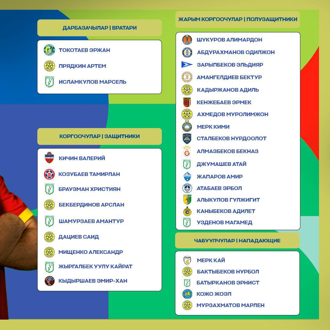 Помимо Кыдыршаева в заявке оказались и другие кыргызстанские футболисты, выступающие за рубежом, в том числе чемпионатах Турции, России, Белоруссии, Люксембурга, Гонконга, Узбекистана.