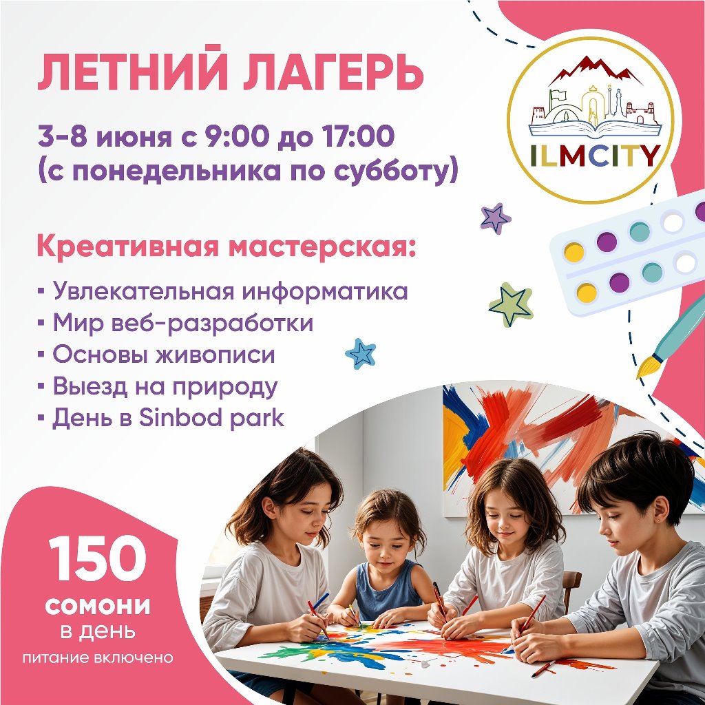 Приглашает детей 7-13 лет в креативную мастерскую с 3 по 8 июня. В программе увлекательная информатика, мир веб-разработки, основы живописи, выезд на природу, день в Sinbod park.